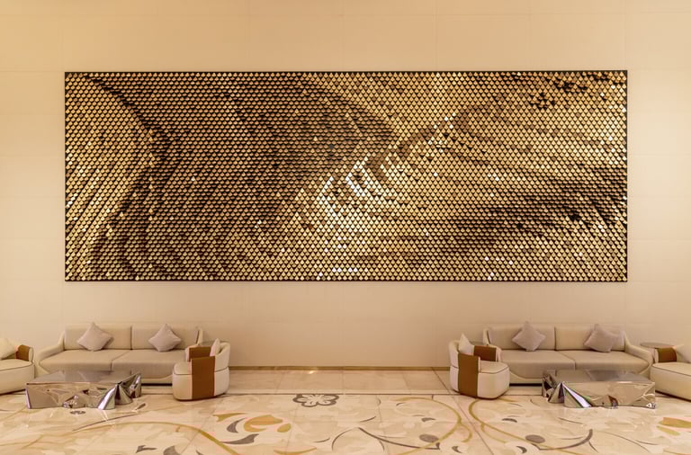 Encircling a skyscraper’s edge, this artwork is a bold yet harmonious statement. Its organic, scale-like design draws from nature, reflecting the rhythms of light and life in Mumbai. Balancing urban energy with biophilic beauty, it transforms chaos into tranquillity, offering a calming sense of order amid the city’s dynamic pulse.