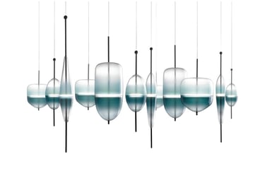 The branching frame of the Haara pendant has a delicate and finely engineered structure derived from close observation of nature. The cylindrical lanterns are assembled from hand-drawn glass and polished brass concealing the lighting element and creating a unique and beautiful lighting diffuser to be admired whether the light is on or off. As in nature, this piece can grow to suit any interior environment.