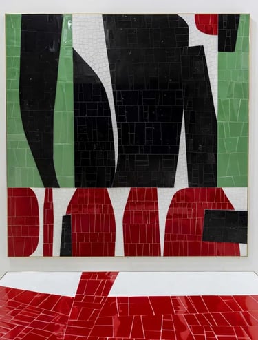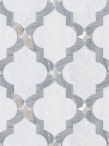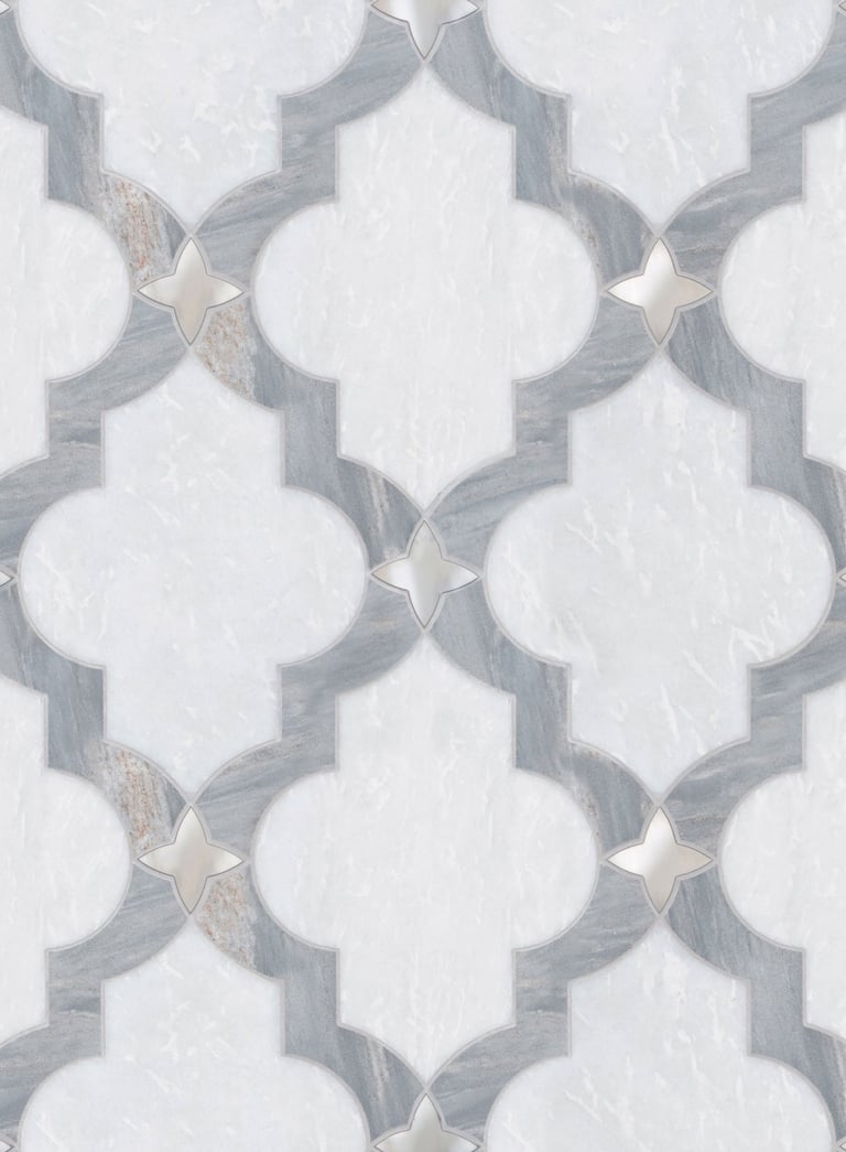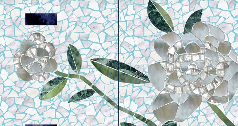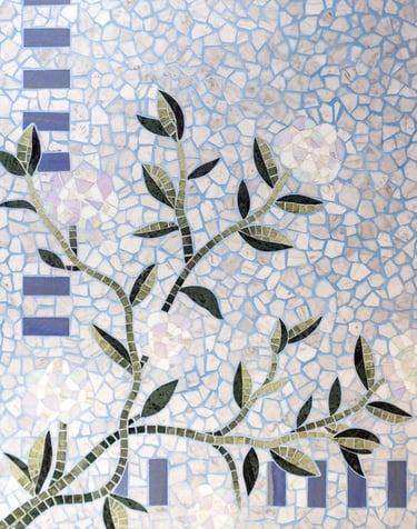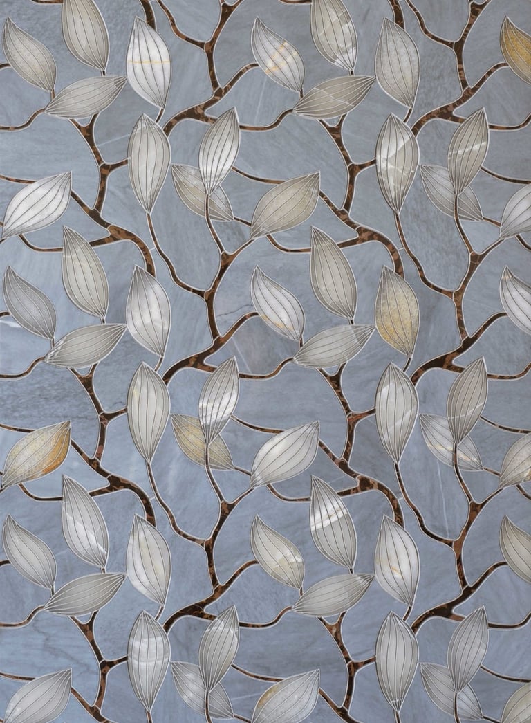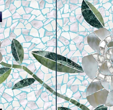 Palladian Mosaic Reimagined blends classical symmetry with organic forms, incorporating mother of pearl, marble, and mirrored glass for a timeless yet modern aesthetic.