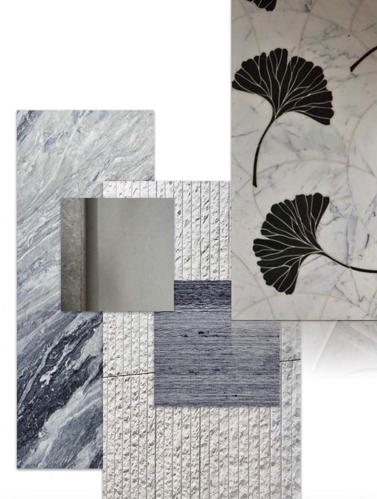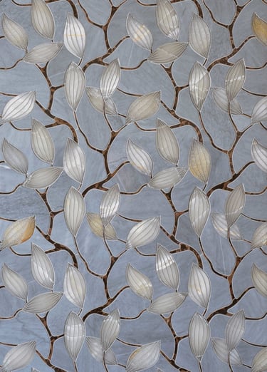 Inspired by the Apuan Alps, this design reflects the harmony between nature and material. Like fallen leaves, delicate inlaid wood fragments land on honed marble, evoking the rhythm of water-washed stone. Each piece tells a story—of journeys, landscapes, and timeless craftsmanship.