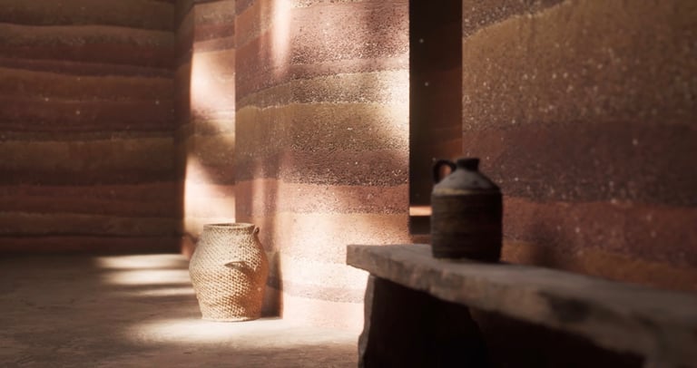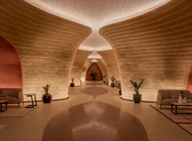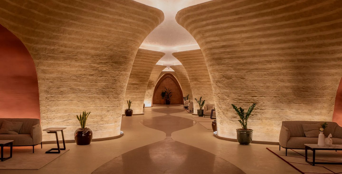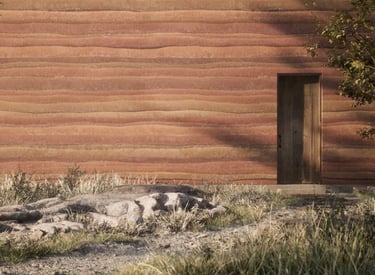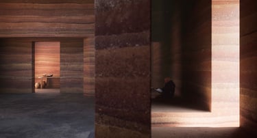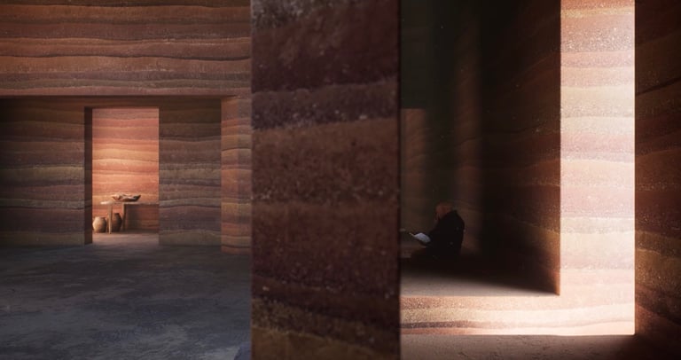 Rammed earth, with its monolithic structure and textural depth, imparts a timeless, sustainable elegance at Curoq’s architectural vision.