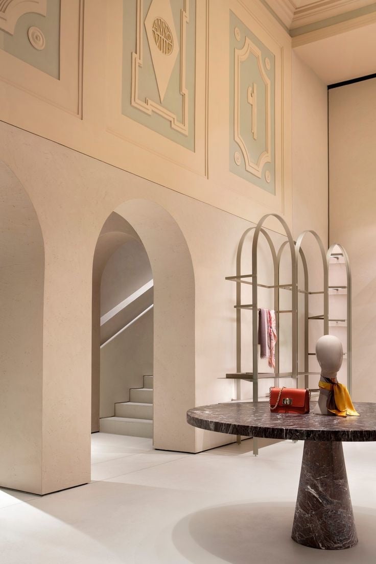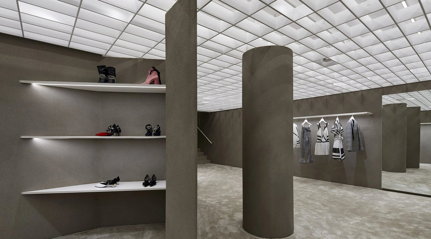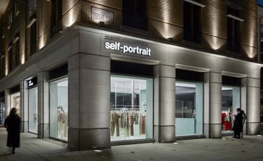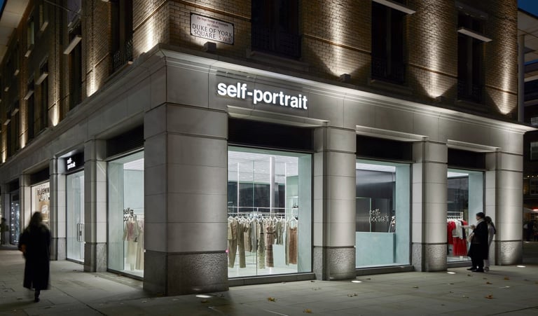 Self-Portrait’s London store, designed by Han Chong and Andreas Kostopoulos, blends minimalism and natural materials, featuring mirrored surfaces and Cornish clay walls in a 200-square-metre space.