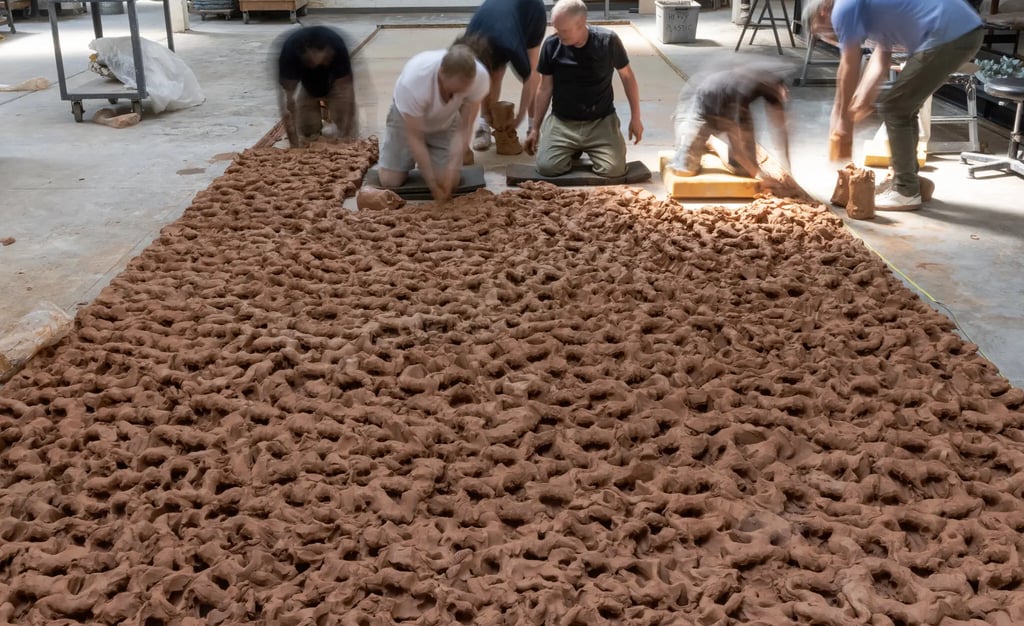 The clay eventually stiffens a bit, and, with the help of a custom-made scythe-like knife, a grid is cut into the surface to divide the piece into sections. The clay is left to dry, which typically takes several weeks, and then is fired (sometimes several times) at temperatures often exceeding 2,000 degrees Fahrenheit in one of the studio’s five custom kilns.