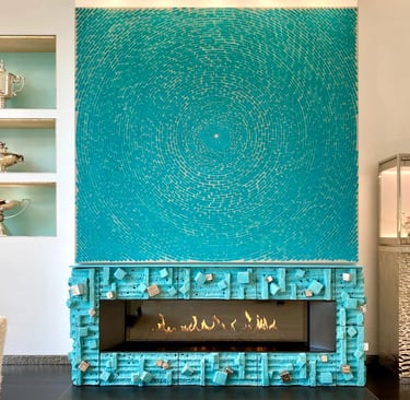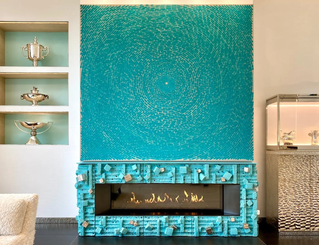 Many of his pieces are, essentially, ceramic murals, from 6 feet to about 50 feet wide, often with patterns that bring to mind the Abstract Expressionist painters like Franz Kline and Barnett Newman. But there also are lamps, like those he has been making for Dior Fine Jewelry, and fireplaces, such as the Tiffany piece, made in a color that Mr. Lane said was inspired by the famous Tiffany Blue and adorned with ceramic cubes covered in platinum leaf. The pieces deliberately show their origins: intensely textured and a bit rugged, and as much art as interior decoration.